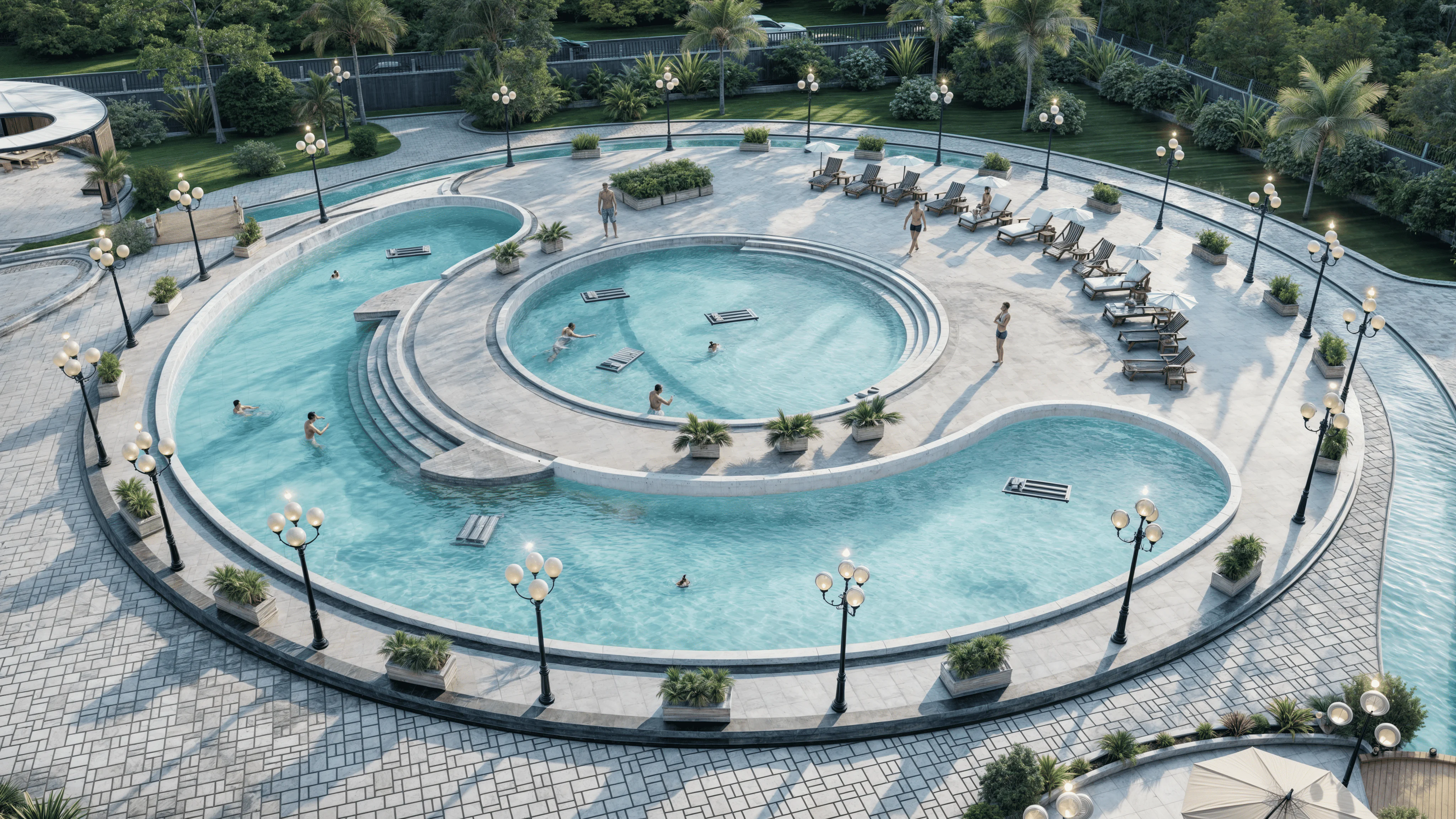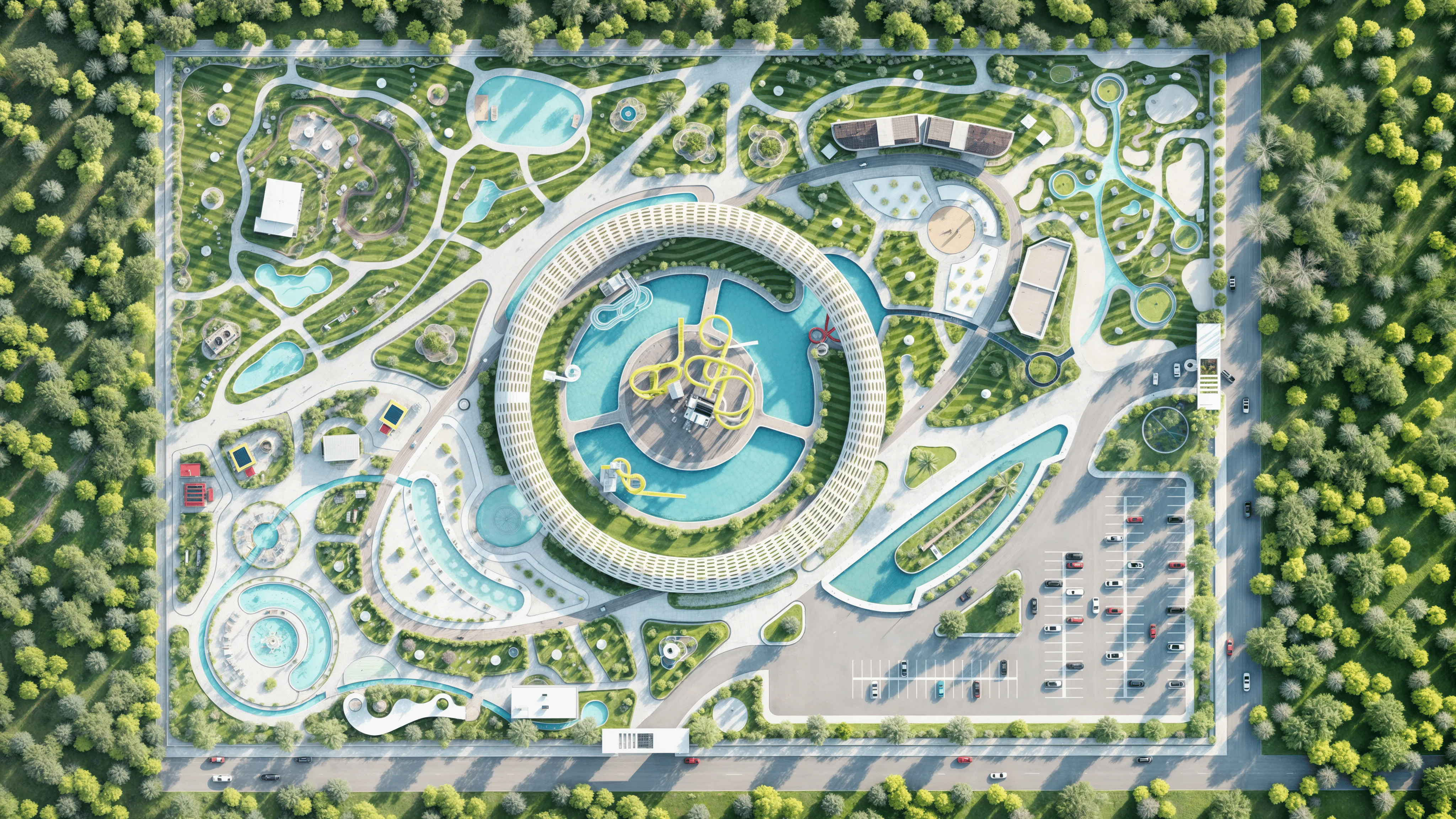 The centerpiece of the water park is a striking circular structure housing a variety of vibrant waterslides, creating a captivating visual focal point. The slides, featuring a mix of twisting and looping forms, cater to both thrill-seekers and families, ensuring a diverse experience for all visitors. Surrounding the main slide complex is a vast pool area, which acts as the central recreational space. This expansive pool is designed with gentle curves and ample lounging areas, allowing guests to relax and enjoy the water while maintaining sightlines towards the main attractions.