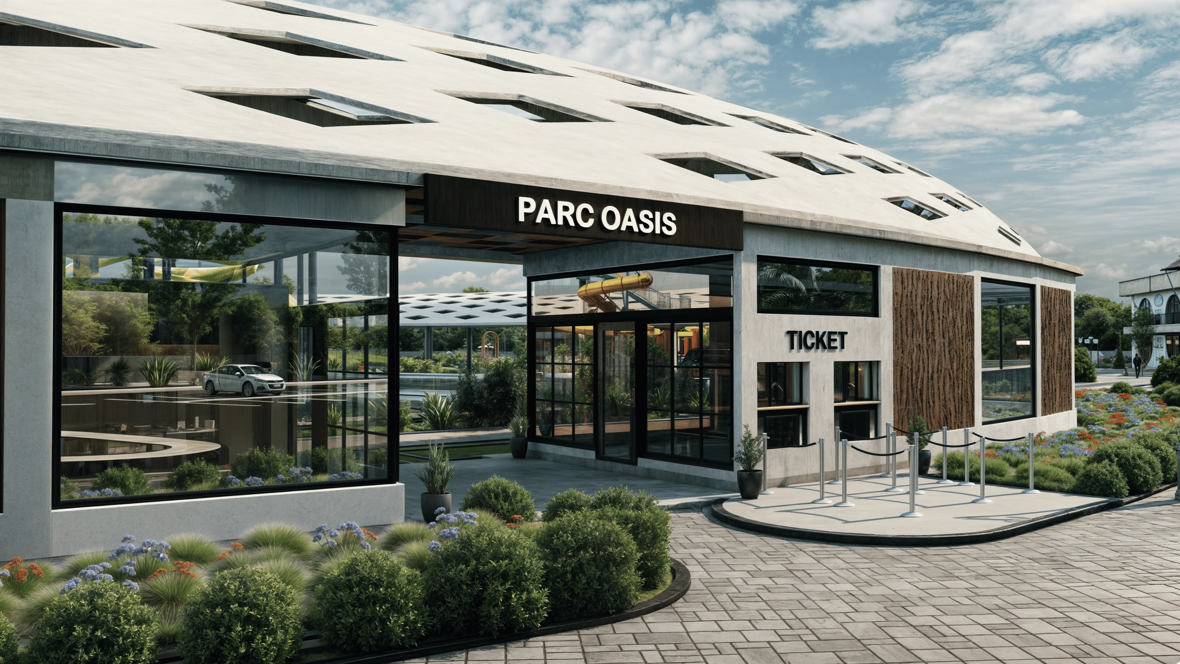 The entry sequence features a well-designed ticketing area that is easily accessible from the adjacent parking lot, ensuring smooth visitor flow. This space is complemented by shaded pathways and landscaped green zones, creating a welcoming arrival experience. Nearby, the park’s food court and eatery zones provide a variety of dining options, strategically positioned to offer views of the slides and pools, enhancing the overall experience with an inviting ambiance.