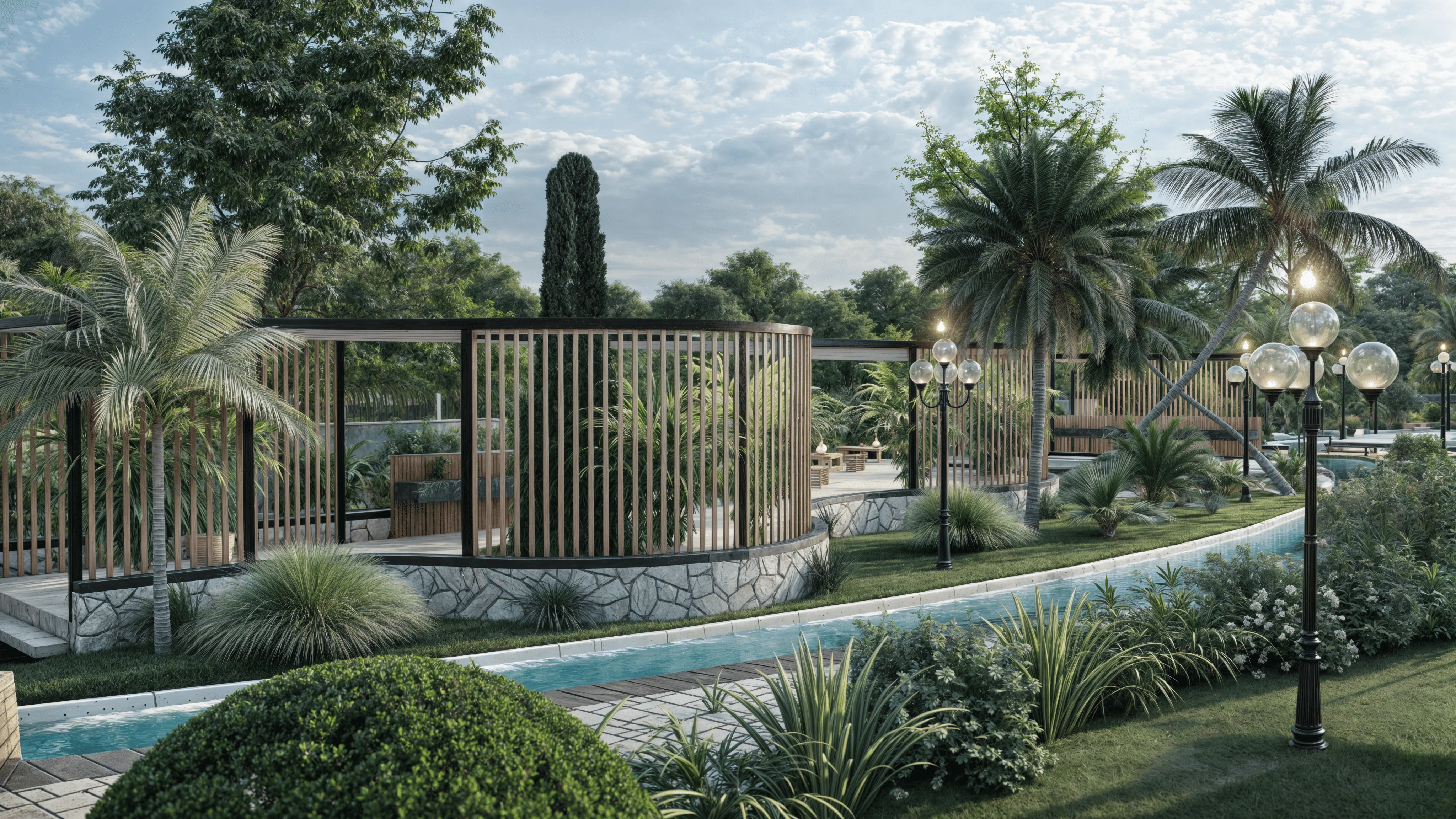 The surrounding landscape design utilizes organic, fluid forms that echo the dynamic nature of water. Lush greenery, integrated seating areas, and shaded pavilions offer ample spots for rest and relaxation, catering to families and individuals alike. The use of a bold, colorful palette throughout the park reflects the vibrant cultural context of Nigeria, enhancing the visual appeal and creating an exciting environment.